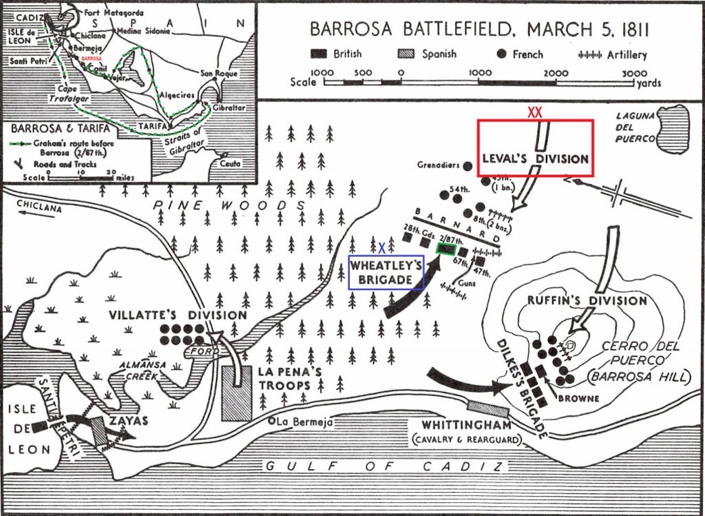 Graham, whose troops were marching through some pinewoods, realised what was happening and decided to counterattack the advancing French divisions. He formed up one brigade in line at the edge of the wood, the 2/87th being in the centre, where it advanced against the onrushing French column. At sixty paces, the British and French exchanged volleys and, although the British suffered some casualties, the effect of the concentrated British volley on the dense mass of French in column was devastating. The British continued advancing and, with bayonets fixed, charged.