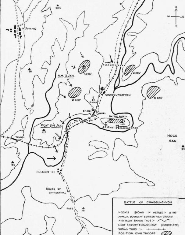The Rifles had moved into their position on 1 January and were well established around Chaegunghyon on 2 January, awaiting an expected Chinese attack.