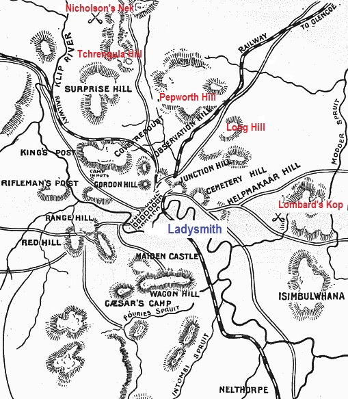 During the night of 29/30 October 1899, a column consisting of the 1st Battalion The Royal Irish Fusiliers, The Gloucestershire Regiment and No 10 Mountain Battery The Royal Artillery, marched north out of Ladysmith led by the Faugh's Commanding Officer, Lieutenant Colonel F R C Carleton. Lieutenant General Sir George White VC, the Commander Ladysmith Garrison, aimed to protect his lines of communication to Colenso in the south by dispersing the advancing Boer forces to the north. White's plan was to take the Boer positions at Long Hill and Pepworth Hill north of Ladysmith, throw a cavalry screen to the east between and beyond Lombard's Kop to protect the right flank, and seize Nicholson's Nek as left flank cover to prevent Boer forces to the west from interfering with the battles for Pepworth and Long Hill.