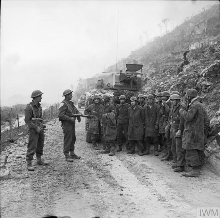 | German prisoners captured by New Zealand troops are held at gunpoint on a road beside a Sherman tank. |