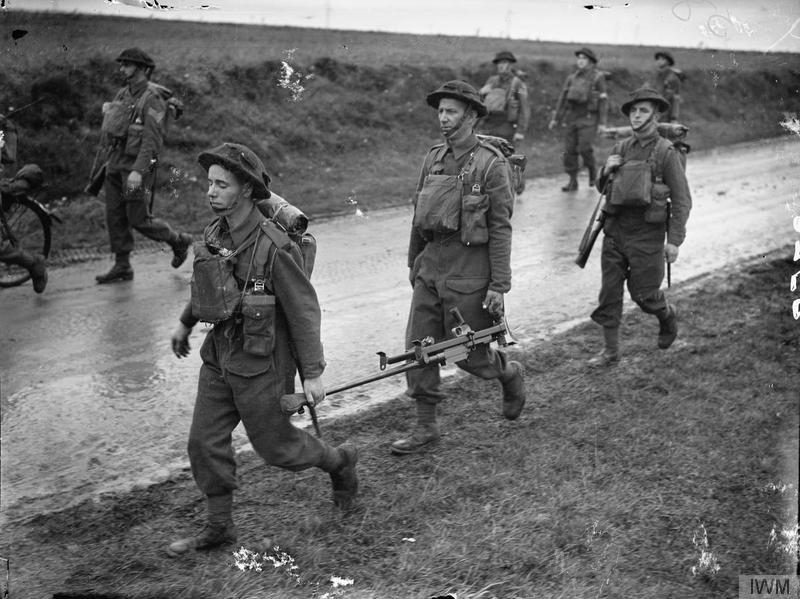 | Men of the Royal Irish Fusiliers on the march at Gavrelle, near Arras, 17 October 1939. The two men in the foreground are carrying a Boys anti-tank rifle. |