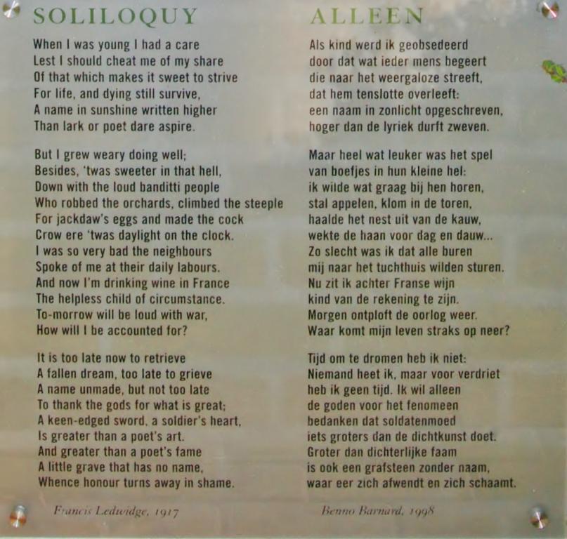 The Irish poet Francis Ledwidge was born on 9 August 1887 in the Boyne Valley at Janeville near the village of Slane in County Meath. He was variously described as the ‘peasant poet’, the ‘soldier poet’ and the ‘poet of the blackbirds’ and had seen action with the 5th Battalion The Royal Inniskilling Fusiliers in Gallipoli but suffered a back injury whilst serving in Serbia.