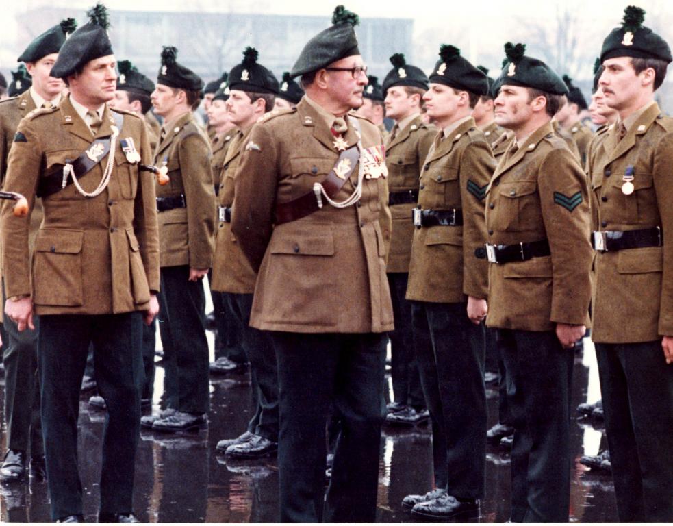 | Major General H E N Bredin CB DSO MC on a rainy St Patrick's Day in Wavell Barracks, Berlin 1982. |