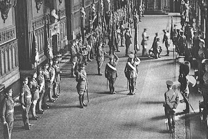 | HM King George V receives the disbanded Irish Regiments' Colours at Windsor Castle, 12 June 1922. |